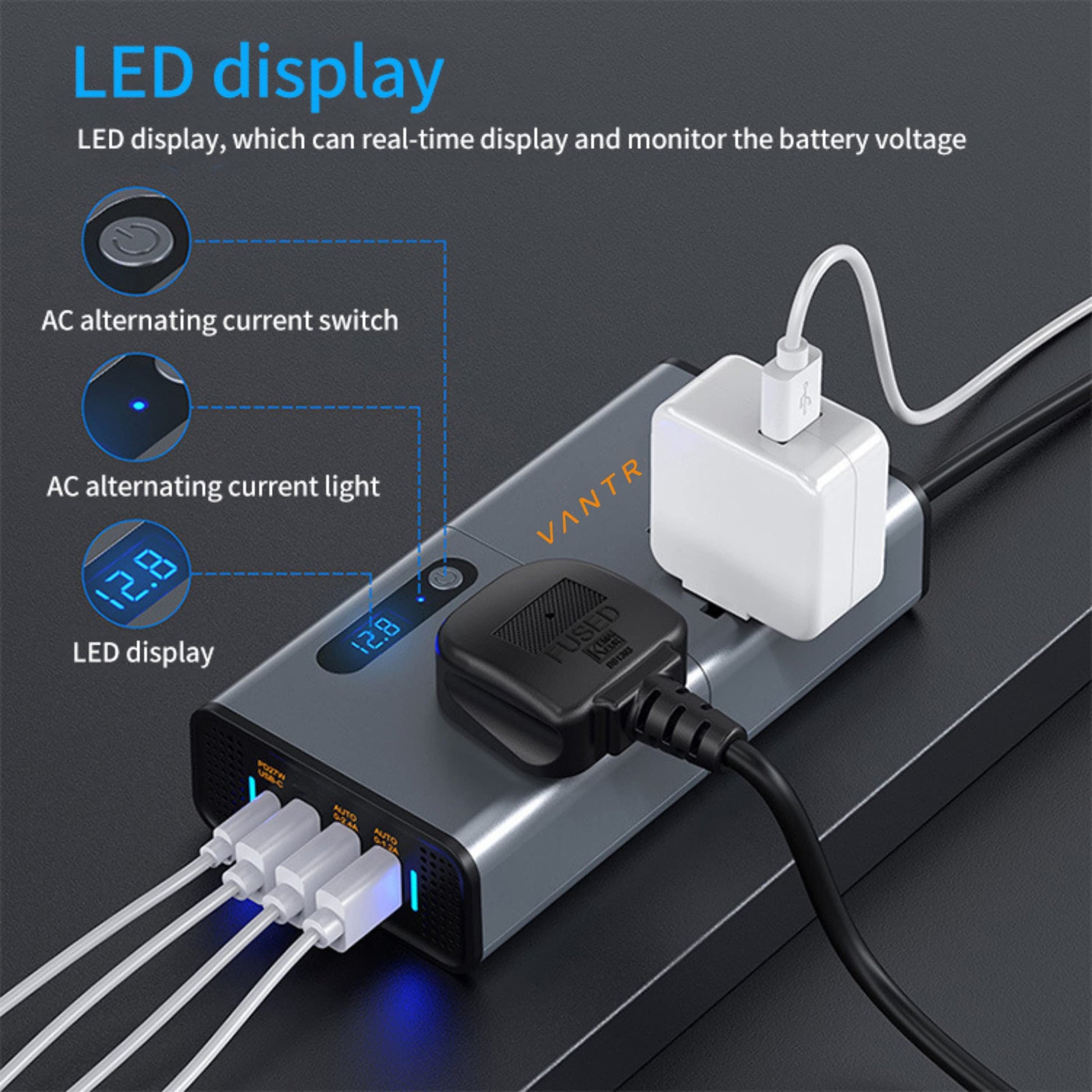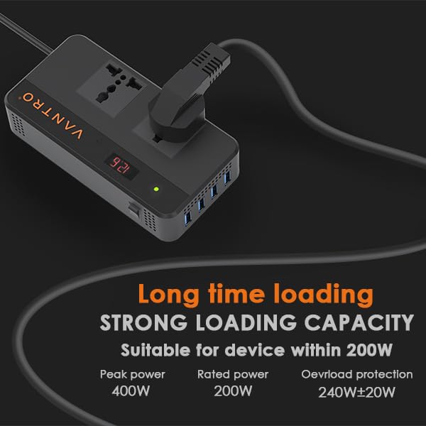 - 【Powerful 200W Charging Inverter】This car power inverter offer continuous DC to AC power which featuress with dual 220V AC outlets and 4 USB ports(2.4A USB+1.2A USB+QC3.0+Type-C), 4 USB ports can charge your phones and tablets simultaneously. Cigarette lighter socket design great for your string lights, laptop, game console, kindle,DVD, iPad etc. NOTE: Please kindly make sure that your device's power and its instantaneous power are less than 200W, otherwise, your devices will not be supported.